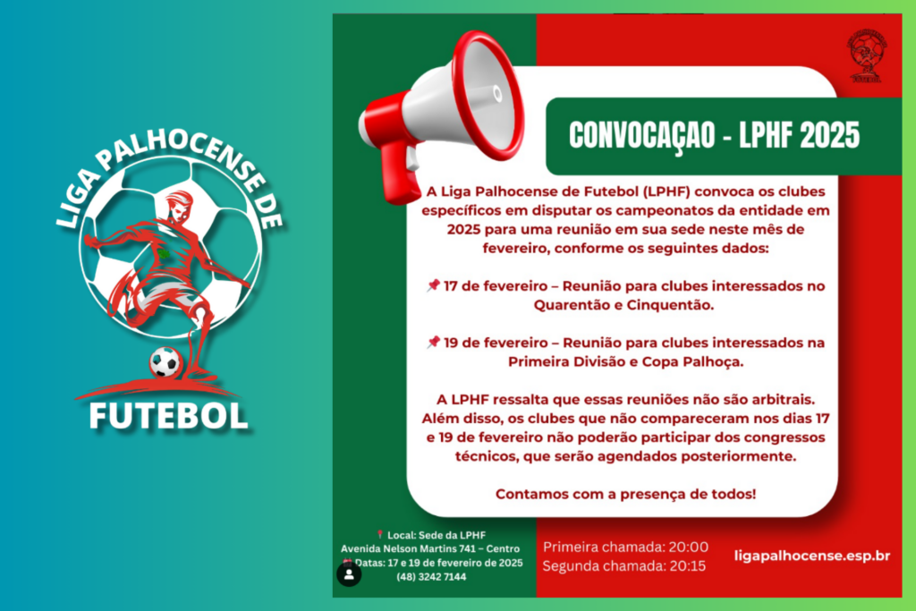 A Liga Palhocense de Futebol (LPHF) convoca os clubes interessados em disputar os campeonatos da entidade em 2025 para uma reunião em sua sede neste mês de fevereiro, conforme os seguintes dados: 📌 17 de fevereiro – Reunião para clubes interessados no Quarentão e Cinquentão.📌 19 de fevereiro – Reunião para clubes interessados na Primeira […]